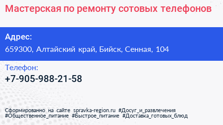Мастерская по ремонту сотовых телефонов по адресу 659300, Алтайский край, Бийск, Сенная, 104 в дальнейшем Организация, размещена в следующих категориях: