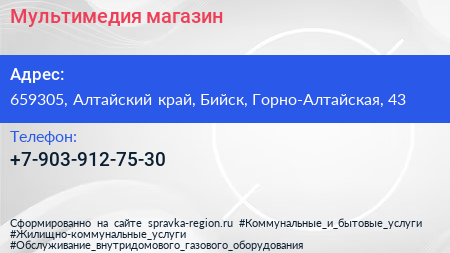 Мультимедия, магазин по адресу 659305, Алтайский край, Бийск, Горно-Алтайская, 43 в дальнейшем Организация, размещена в следующих категориях: