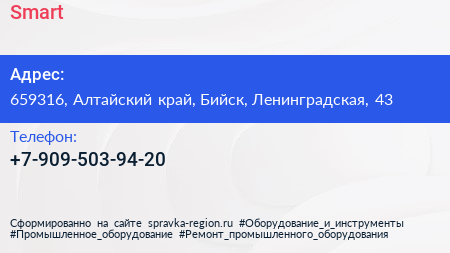 Smart по адресу 659316, Алтайский край, Бийск, Ленинградская, 43 в дальнейшем Организация, размещена в следующих категориях: