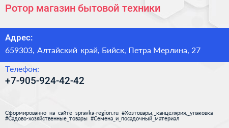Ротор, магазин бытовой техники по адресу 659303, Алтайский край, Бийск, Петра Мерлина, 27 в дальнейшем Организация, размещена в следующих категориях: