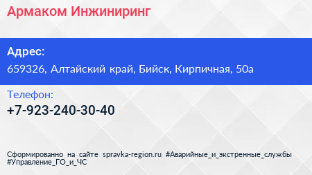 Армаком Инжиниринг по адресу 659326, Алтайский край, Бийск, Кирпичная, 50а в дальнейшем Организация, размещена в следующих категориях: