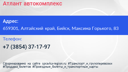 Атлант, автокомплекс по адресу 659301, Алтайский край, Бийск, Максима Горького, 83 в дальнейшем Организация, размещена в следующих категориях: