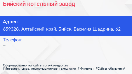 Бийский котельный завод по адресу 659328, Алтайский край, Бийск, Василия Шадрина, 62 в дальнейшем Организация, размещена в следующих категориях: