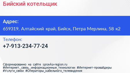 Бийский котельщик по адресу 659319, Алтайский край, Бийск, Петра Мерлина, 58 к2 в дальнейшем Организация, размещена в следующих категориях: