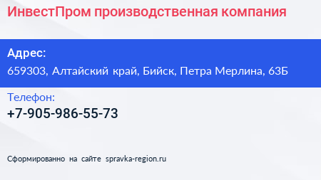 ИнвестПром, производственная компания по адресу 659303, Алтайский край, Бийск, Петра Мерлина, 63Б в дальнейшем Организация, размещена в следующих категориях: