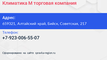 Климатика-М, торговая компания по адресу 659321, Алтайский край, Бийск, Советская, 217 в дальнейшем Организация, размещена в следующих категориях: