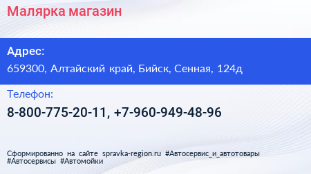 Малярка, магазин по адресу 659300, Алтайский край, Бийск, Сенная, 124д в дальнейшем Организация, размещена в следующих категориях: