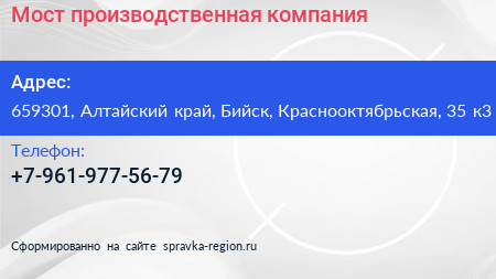 Мост, производственная компания по адресу 659301, Алтайский край, Бийск, Краснооктябрьская, 35 к3 в дальнейшем Организация, размещена в следующих категориях: