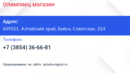 Олимпиец, магазин по адресу 659321, Алтайский край, Бийск, Советская, 214 в дальнейшем Организация, размещена в следующих категориях: