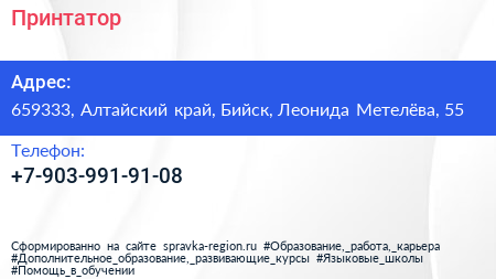 Принтатор по адресу 659333, Алтайский край, Бийск, Леонида Метелёва, 55 в дальнейшем Организация, размещена в следующих категориях: