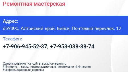 Ремонтная мастерская по адресу 659300, Алтайский край, Бийск, Почтовый переулок, 12 в дальнейшем Организация, размещена в следующих категориях: