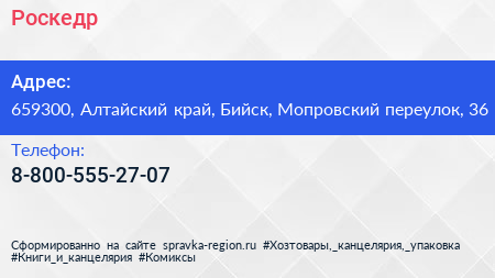 Роскедр по адресу 659300, Алтайский край, Бийск, Мопровский переулок, 36 в дальнейшем Организация, размещена в следующих категориях: