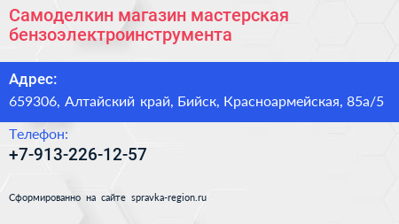 Самоделкин, магазин-мастерская бензоэлектроинструмента по адресу 659306, Алтайский край, Бийск, Красноармейская, 85а/5 в дальнейшем Организация, размещена в следующих категориях: