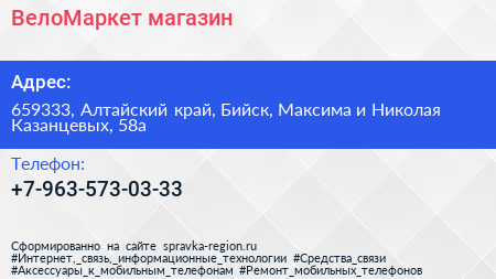 ВелоМаркет, магазин по адресу 659333, Алтайский край, Бийск, Максима и Николая Казанцевых, 58а в дальнейшем Организация, размещена в следующих категориях: