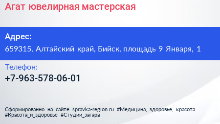 Агат, ювелирная мастерская по адресу 659315, Алтайский край, Бийск, площадь 9 Января, 1 в дальнейшем Организация, размещена в следующих категориях: