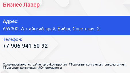 Бизнес Лазер по адресу 659300, Алтайский край, Бийск, Советская, 2 в дальнейшем Организация, размещена в следующих категориях: