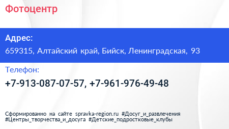 Фотоцентр по адресу 659315, Алтайский край, Бийск, Ленинградская, 93 в дальнейшем Организация, размещена в следующих категориях: