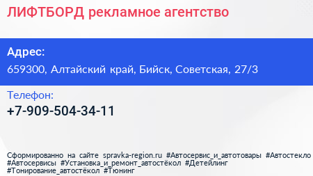 ЛИФТБОРД, рекламное агентство по адресу 659300, Алтайский край, Бийск, Советская, 27/3 в дальнейшем Организация, размещена в следующих категориях: