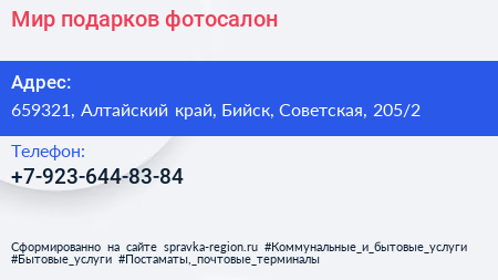 Мир подарков, фотосалон по адресу 659321, Алтайский край, Бийск, Советская, 205/2 в дальнейшем Организация, размещена в следующих категориях: