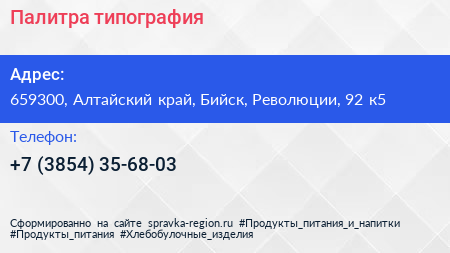 Палитра, типография по адресу 659300, Алтайский край, Бийск, Революции, 92 к5 в дальнейшем Организация, размещена в следующих категориях:
