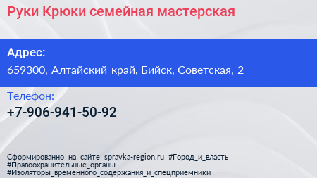 Руки Крюки, семейная мастерская по адресу 659300, Алтайский край, Бийск, Советская, 2 в дальнейшем Организация, размещена в следующих категориях: