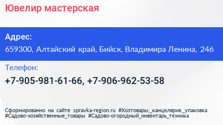 Ювелир, мастерская по адресу 659300, Алтайский край, Бийск, Владимира Ленина, 246 в дальнейшем Организация, размещена в следующих категориях:
