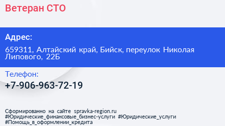 Ветеран, СТО по адресу 659311, Алтайский край, Бийск, переулок Николая Липового, 22Б в дальнейшем Организация, размещена в следующих категориях: