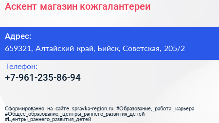 Аскент, магазин кожгалантереи по адресу 659321, Алтайский край, Бийск, Советская, 205/2 в дальнейшем Организация, размещена в следующих категориях: