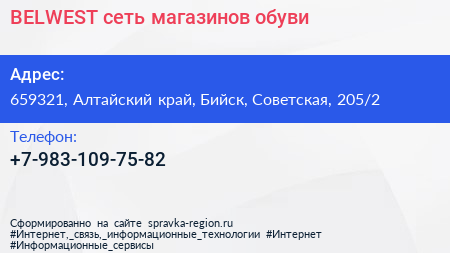 BELWEST, сеть магазинов обуви по адресу 659321, Алтайский край, Бийск, Советская, 205/2 в дальнейшем Организация, размещена в следующих категориях: