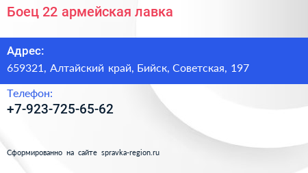 Боец 22, армейская лавка по адресу 659321, Алтайский край, Бийск, Советская, 197 в дальнейшем Организация, размещена в следующих категориях: