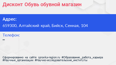 Дисконт-Обувь, обувной магазин по адресу 659300, Алтайский край, Бийск, Сенная, 104 в дальнейшем Организация, размещена в следующих категориях: