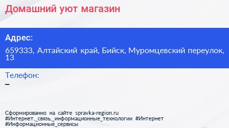 Домашний уют, магазин по адресу 659333, Алтайский край, Бийск, Муромцевский переулок, 13 в дальнейшем Организация, размещена в следующих категориях:
