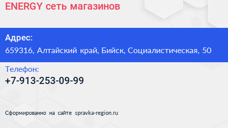ENERGY, сеть магазинов по адресу 659316, Алтайский край, Бийск, Социалистическая, 50 в дальнейшем Организация, размещена в следующих категориях:
