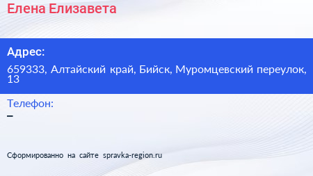 Елена-Елизавета по адресу 659333, Алтайский край, Бийск, Муромцевский переулок, 13 в дальнейшем Организация, размещена в следующих категориях: