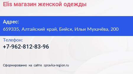 Elis, магазин женской одежды по адресу 659335, Алтайский край, Бийск, Ильи Мухачёва, 200 в дальнейшем Организация, размещена в следующих категориях: