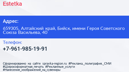 Estetka по адресу 659305, Алтайский край, Бийск, имени Героя Советского Союза Васильева, 40 в дальнейшем Организация, размещена в следующих категориях: