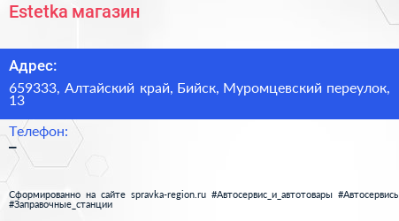 Estetka, магазин по адресу 659333, Алтайский край, Бийск, Муромцевский переулок, 13 в дальнейшем Организация, размещена в следующих категориях: