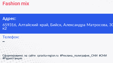 Fashion mix по адресу 659316, Алтайский край, Бийск, Александра Матросова, 30 к2 в дальнейшем Организация, размещена в следующих категориях: