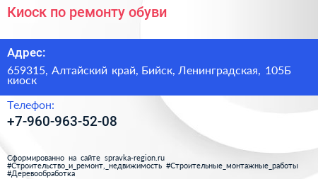 Киоск по ремонту обуви по адресу 659315, Алтайский край, Бийск, Ленинградская, 105Б киоск в дальнейшем Организация, размещена в следующих категориях: