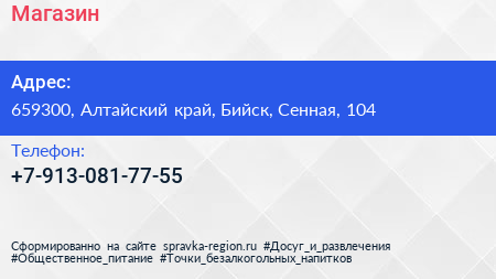 Магазин по адресу 659300, Алтайский край, Бийск, Сенная, 104 в дальнейшем Организация, размещена в следующих категориях: