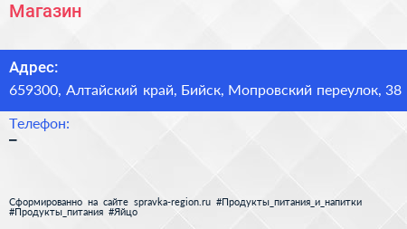 Магазин по адресу 659300, Алтайский край, Бийск, Мопровский переулок, 38 в дальнейшем Организация, размещена в следующих категориях:
