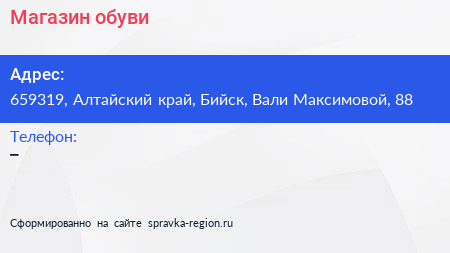 Магазин обуви по адресу 659319, Алтайский край, Бийск, Вали Максимовой, 88 в дальнейшем Организация, размещена в следующих категориях: