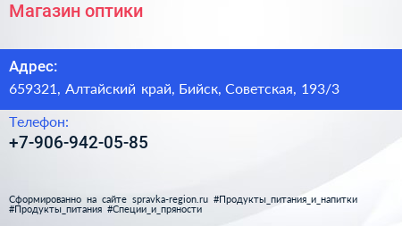 Магазин оптики по адресу 659321, Алтайский край, Бийск, Советская, 193/3 в дальнейшем Организация, размещена в следующих категориях:
