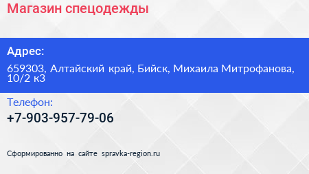Магазин спецодежды по адресу 659303, Алтайский край, Бийск, Михаила Митрофанова, 10/2 к3 в дальнейшем Организация, размещена в следующих категориях: