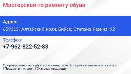 Мастерская по ремонту обуви по адресу 659315, Алтайский край, Бийск, Степана Разина, 92 в дальнейшем Организация, размещена в следующих категориях: