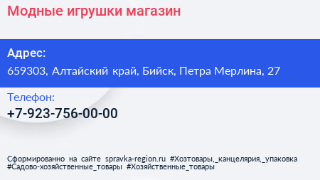 Модные игрушки, магазин по адресу 659303, Алтайский край, Бийск, Петра Мерлина, 27 в дальнейшем Организация, размещена в следующих категориях: