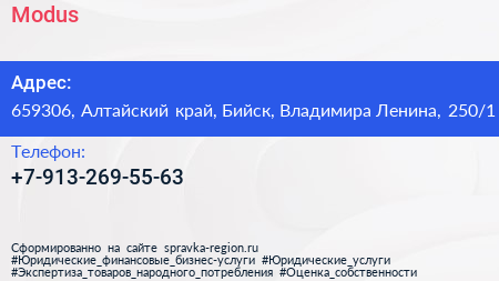 Modus по адресу 659306, Алтайский край, Бийск, Владимира Ленина, 250/1 в дальнейшем Организация, размещена в следующих категориях: