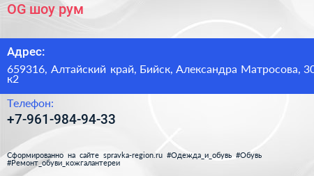 OG, шоу-рум по адресу 659316, Алтайский край, Бийск, Александра Матросова, 30 к2 в дальнейшем Организация, размещена в следующих категориях: