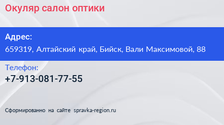 Окуляр, салон оптики по адресу 659319, Алтайский край, Бийск, Вали Максимовой, 88 в дальнейшем Организация, размещена в следующих категориях: