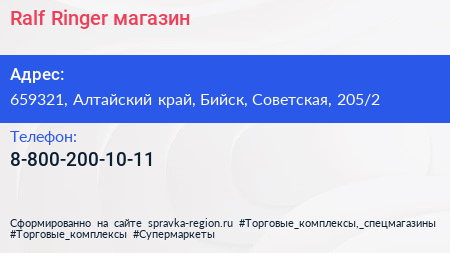 Ralf Ringer, магазин по адресу 659321, Алтайский край, Бийск, Советская, 205/2 в дальнейшем Организация, размещена в следующих категориях: